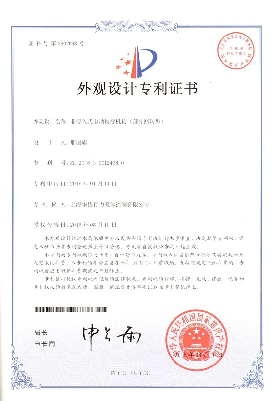 非侵入式电动执行机构(部分回转型)专利证书