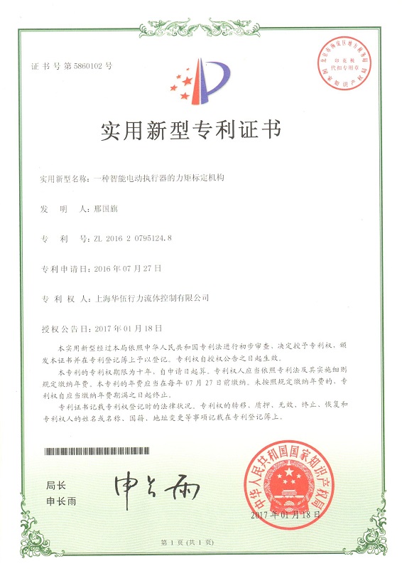 一种智能电动执行器的力矩标定机构专利证书